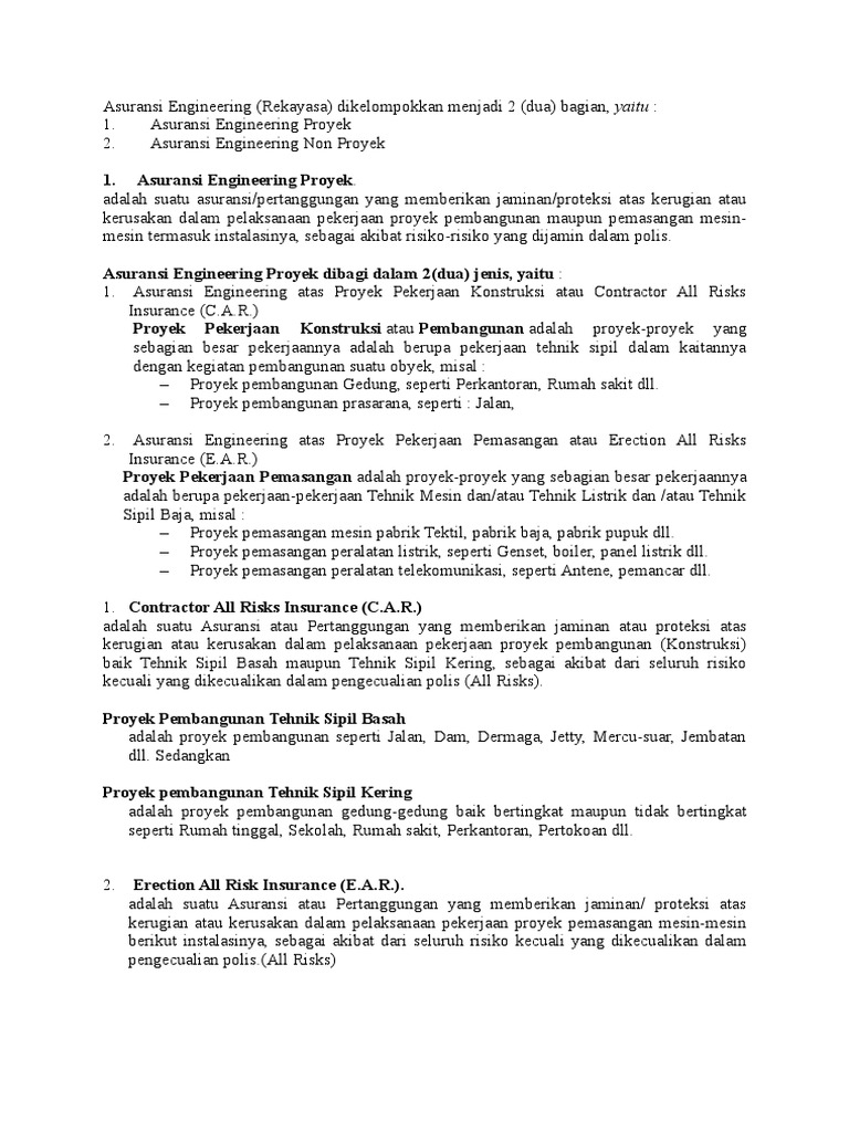 Asuransi Car Konstruksi. Asuransi car memberikan jaminan atas kerusakan atau kerugian objek yang dipertanggungkan pada saat pelaksanaan pembangunan. Izin usaha asuransi sendiri didapat car life insurance dari kementerian keuangan republik indonesia dengan no.